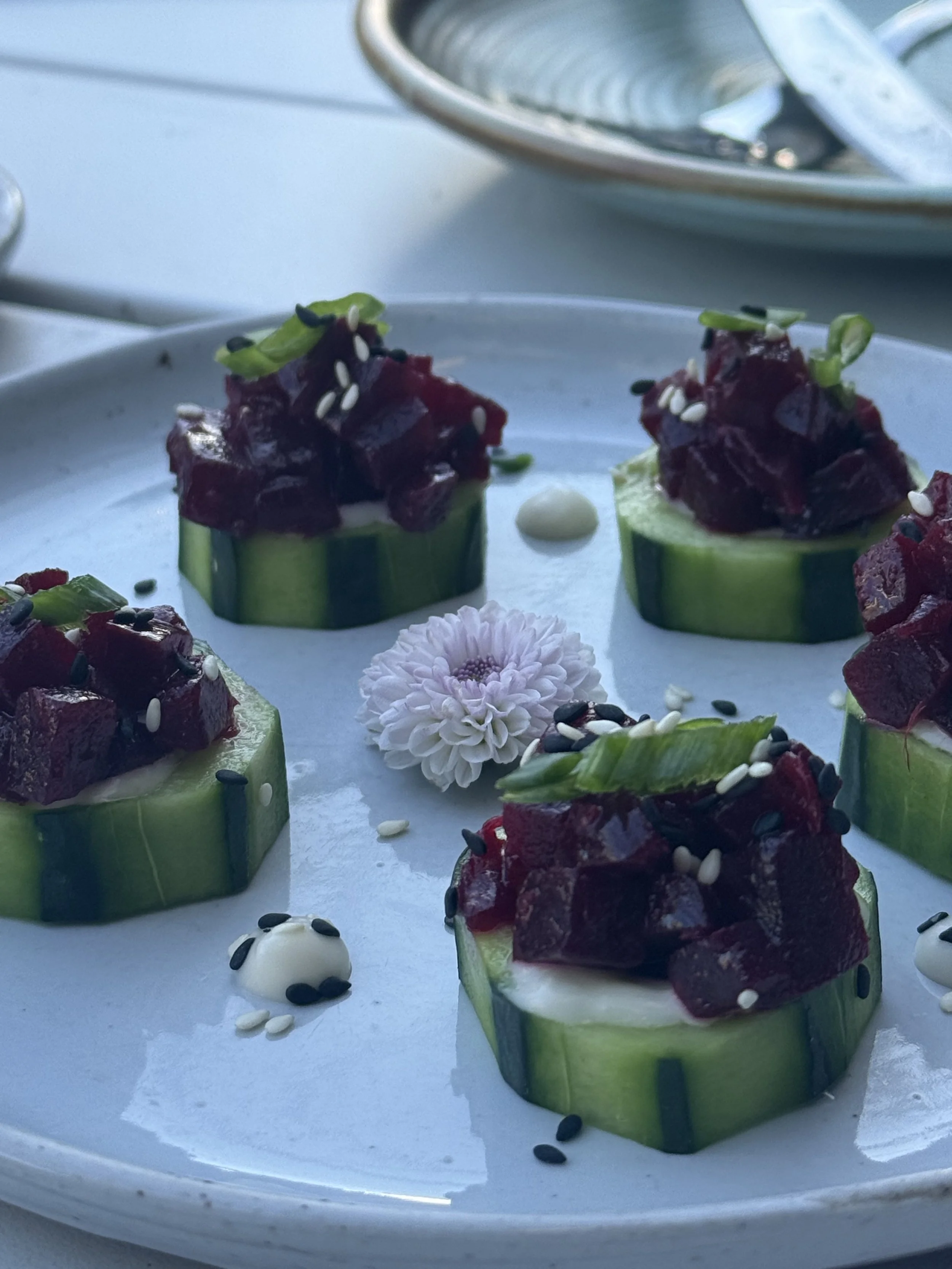 beet tartare | wasabi crème fraîche, cucumber, sesame 12
